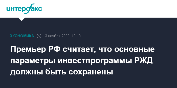 Москва. 13 ноября. INTERFAX.RU - Основные параметры ранее намеченной программы ОАО "Российские железные дороги" (РЖД) должны быть сохранены, заявил премьер-министр РФ Владимир Путин, открывая заседание правительства РФ.