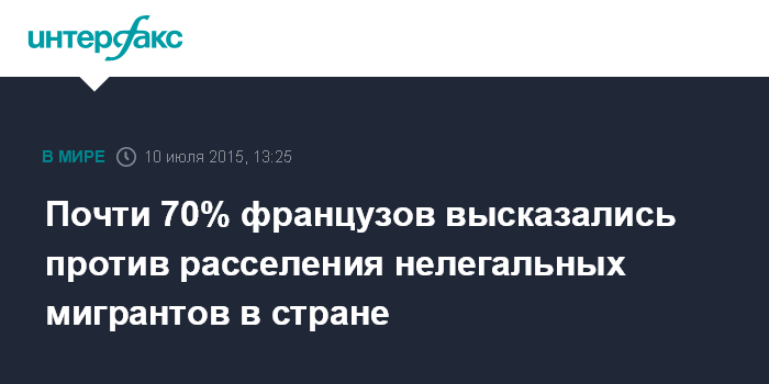 Москва. 10 июля. INTERFAX.RU - Семь из десяти французов выступают против расселения нелегальных мигрантов во Франции, свидетельствуют данные опроса, проведенного институтом iFop совместно с газетой Figaro.