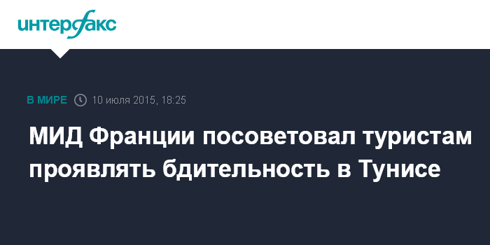 Москва. 10 июля. INTERFAX.RU - МИД Франции заявил в пятницу, что не планирует следовать примеру Великобритании, которая после бойни на пляже в июне в Тунисе предостерегла своих подданных от поездок на выходные дни в эту страну.