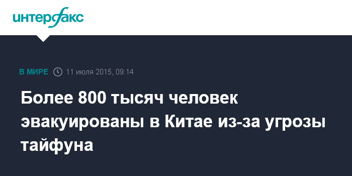 Москва. 11 июля. INTERFAX.RU - Китайские власти эвакуировали около 865 тысяч человек и отменили сотни авиарейсов из-за порывов ветра, достигающих скорости 200 км/ч, сообщило агентство Associated Press.