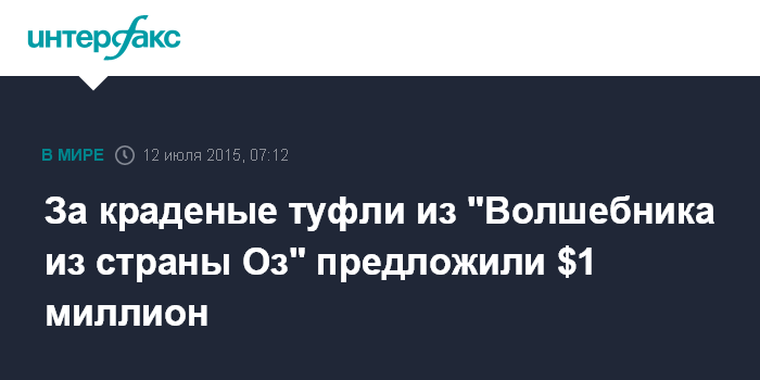 Москва. 12 июля. INTERFAX.RU - Награда в один миллион долларов объявлена за подсказку о том, где могут находиться украденные десять лет назад красные туфельки, в которых снималась в экранизации "Волшебника страны Оз" в 1939 году Джуди Гарланд, передает BBC News.