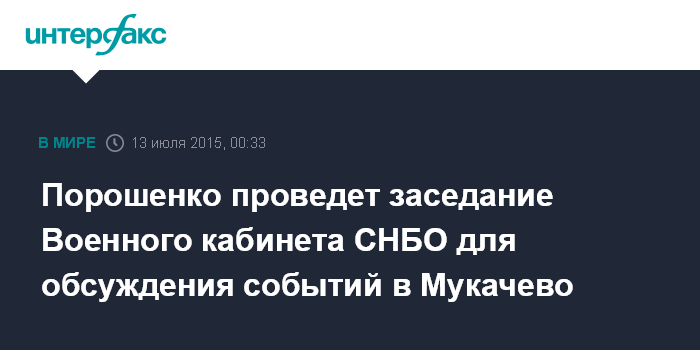 Москва. 13 июля. INTERFAX.RU - Президент Украины Петр Порошенко в понедельник, 13 июля, проведет заседание Военного кабинета Совета национальной безопасности и обороны (СНБО), на котором будут обсуждаться события в Мукачево (Закарпатская область), сообщил пресс-секретарь главы государаства Святослав Цеголко.