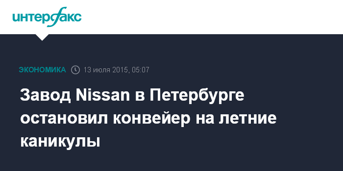 Москва. 13 июля. INTERFAX.RU - Завод автоконцерна Nissan в Петербурге остановил конвейер на период летнего коллективного отпуска.