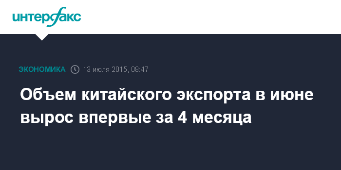 Москва. 13 июля. INTERFAX.RU - Объем китайского экспорта вырос в июне 2015 года впервые за четыре месяца, согласно официальным данным, экспорт увеличился на 2,1% относительно июня прошлого года.