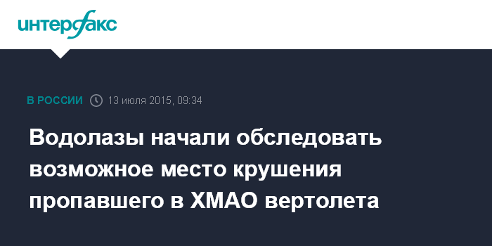 Москва. 13 июля. INTERFAX.RU - Водолазы в понедельник продолжают совершать погружения в районе реки, где может находиться вертолет Ми-8, пропавший в Ханты-Мансийском автономном округе 3 июля, сообщили агентству "Интерфакс" пресс-службе Уральского регионального центра МЧС РФ.