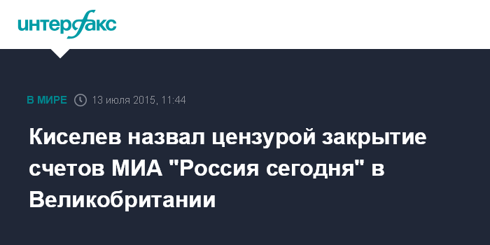 Москва. 13 июля. INTERFAX.RU - Генеральный директор МИА "Россия сегодня" Дмитрий Киселев считает, что блокирование счетов этого информационного агентства в Великобритании является актом цензуры.
