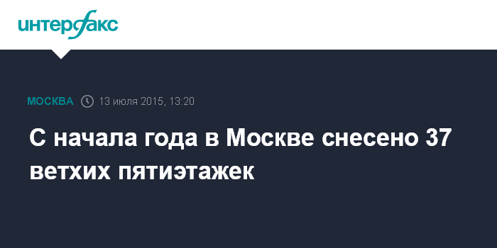 Москва. 13 июля. INTERFAX.RU - За первое полугодие 2015 года в Москве снесено 37 ветхих пятиэтажек, сообщил глава департамента строительства Москвы Андрей Бочкарев.