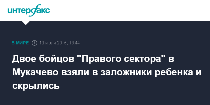 Москва. 13 июля. INTERFAX.RU - Правоохранители разыскивают двух бойцов "Правого сектора" в Мукачевском районе Закарпатской области, взявших в заложники 6-летнего ребенка, который позже оказался на свободе, сообщил агентству "Интерфакс" источник в МВД.