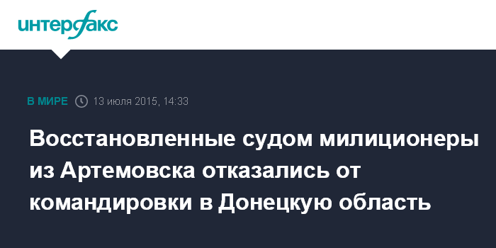 Москва. 13 июля. INTERFAX.RU - Двое руководящих работников милиции Артемовска, уволенные в 2014 году за дискредитацию органов внутренних дел и впоследствии восстановленные в должности решениями суда, отказались нести службу в прифронтовых городах Марьинка и Авдеевка, куда были направлены в связи со служебной необходимостью.