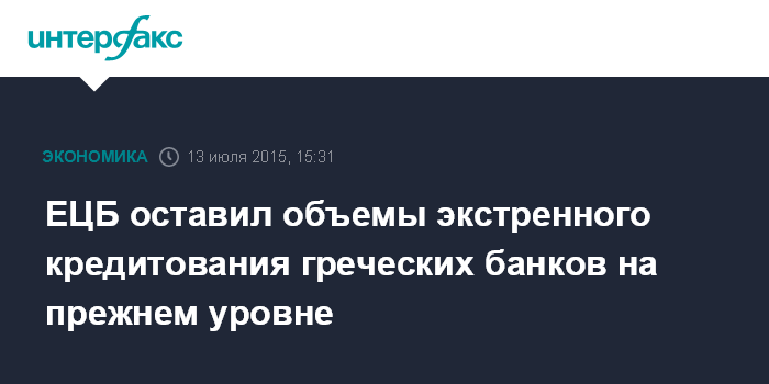 Москва. 13 июля. INTERFAX.RU – Европейский центральный банк после соглашения Греции с кредиторами решил не менять объемы финансирования греческих банков в рамках программы экстренного предоставления ликвидности (Emergency Liquidity Assistance, ELA), сообщили агентству Bloomberg информированные источники.