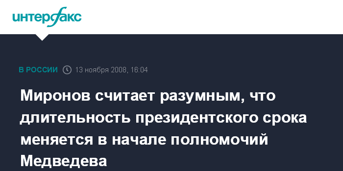 При этом Миронов подчеркнул, что ожидал внесения поправок в Конституцию либо в конце 2008 г., либо в начале 2009-го.