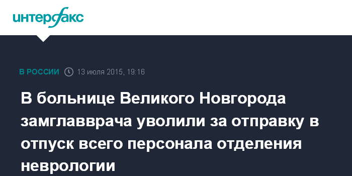 В больнице Великого Новгорода замглавврача уволили за отправку в отпуск всего персонала отделения неврологии