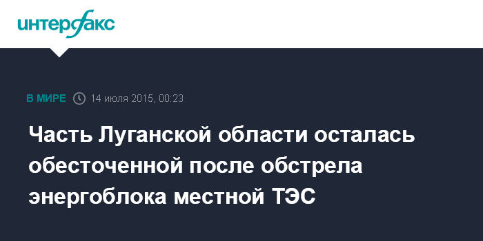 Москва. 14 июля. INTERFAX.RU - На Луганской тепловой электрической станции (ТЭС) аварийно отключился энергоблок, в результате северная часть Луганской области частично обесточена, сообщил пресс-секретарь Антикризисного штаба ДТЭК Антон Ковалишин в своем фейсбуке.