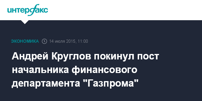 Москва. 14 июля. INTERFAX.RU – Андрей Круглов примерно неделю назад покинул пост начальника финансово-экономического департамента (ФЭД) "Газпрома", сохранив пост заместителя председателя правления "Газпрома", сообщили Интерфаксу несколько источников, знакомых с ситуацией.