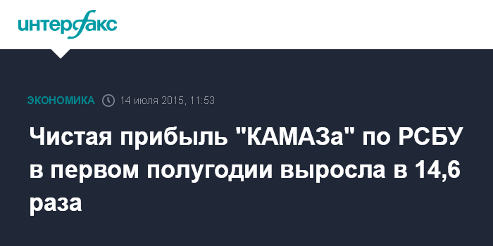 Москва. 14 июля. INTERFAX.RU – Чистая прибыль "КАМАЗа" по РСБУ в первом полугодии 2015 года выросла в 14,6 раза по сравнению с тем же периодом 2014 г., до 161,586 млн руб., следует из отчета компании.