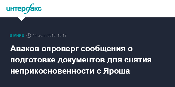 Москва. 14 июля. INTERFAX.RU - Глава МВД Украины Арсен Аваков опроверг информацию о якобы имевшей место подготовке МВД и Генпрокуратурой документов о снятии с лидера "Правого сектора", парламентария Дмитрия Яроша депутатской неприкосновенности.