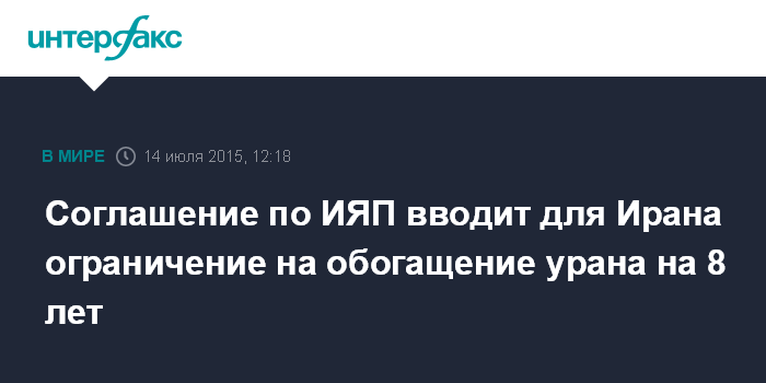 Москва. 14 июля. INTERFAX.RU - Ограничения на обогащение Ираном урана сроком на восемь лет предусмотрены соглашением по иранской ядерной программе.