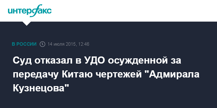 Суд отказал в УДО осужденной за передачу Китаю чертежей "Адмирала Кузнецова"