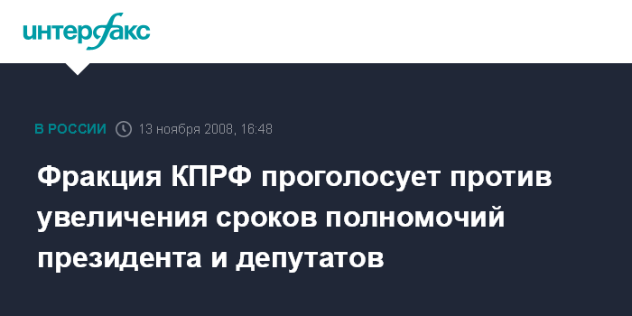 Москва. 13 ноября. INTERFAX.RU - Фракция КПРФ будет консолидировано голосовать в пятницу против принятия Государственной Думой законопроекта, предусматривающего увеличение сроков полномочий главы государства до шести лет, а Государственной думы - до пяти лет.