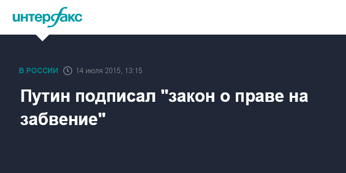 Москва. 14 июля. INTERFAX.RU - Президент России Владимир Путин подписал так называемый "закон о праве на забвение", обязывающий интернет-поисковики удалять ссылки на информацию о гражданах по требованию последних.