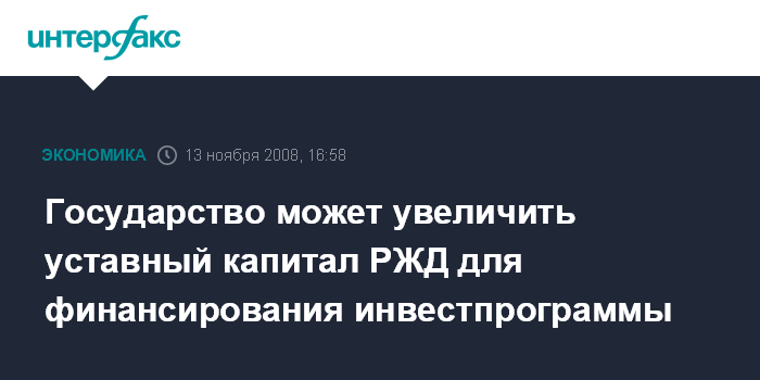 Москва. 13 ноября. INTERFAX.RU - Государство может увеличить уставный капитал ОАО "Российские железные дороги" (РЖД), чтобы привлечь финансирование для инвестпрограммы на 2009 г., сообщил журналистам в четверг глава РЖД Владимир Якунин.
