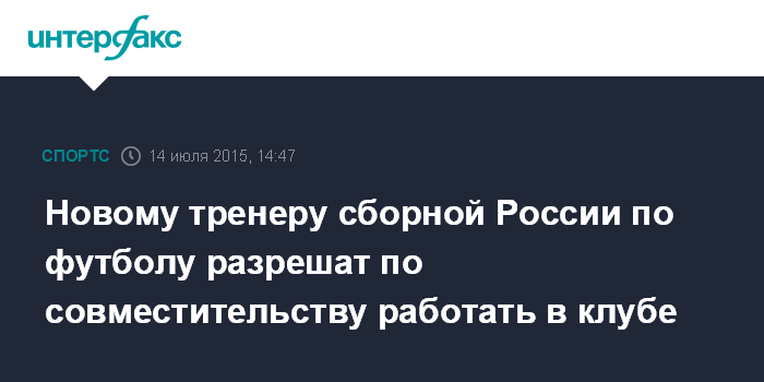 Москва. 14 июля. INTERFAX.RU - Новый тренер сборной России по футболу сможет совмещать должность в клубе и в сборной до чемпионата Европы.