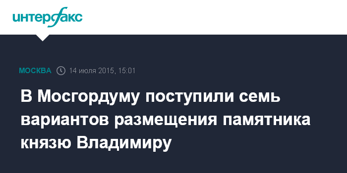Москва. 14 июля. INTERFAX.RU - В Мосгордуму поступило 7 обращений по вопросу изменения места установки памятника князю Владимиру, но дата рассмотрения вопроса пока не назначена, сообщил председатель городского парламента Алексей Шапошников на пресс-конференции во вторник.