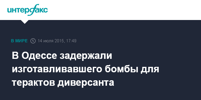 Москва. 14 июля. INTERFAX.RU - Сотрудники Службы безопасности Украины задержали в Одессе местного жителя, который изготавливал самодельные взрывные устройства для террористически-диверсионной группы, осуществившей теракты на Одесской железной дороге.