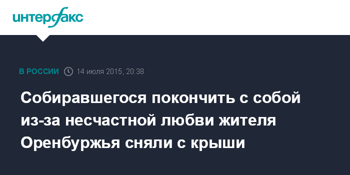 Москва. 14 июля. INTERFAX.RU - Молодого человека, забравшегося на крышу Ленинского районного суда Оренбурга и собиравшегося покончить с собой из-за несчастной любви, уговорили сойти на землю. Об этом пишут местные СМИ.