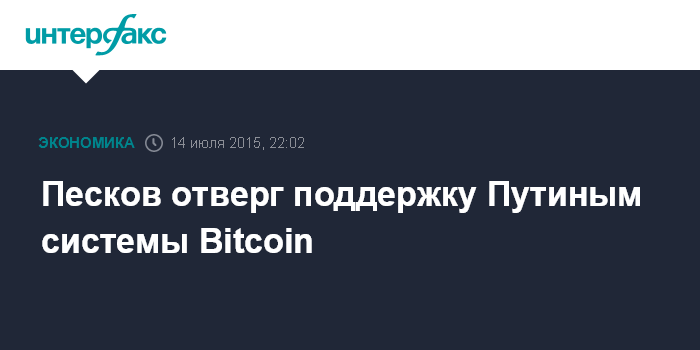 Москва. 14 июля. INTERFAX.RU - Заявление президента РФ Владимира Путина в ходе общения со специалистами в сфере IT во вторник нельзя воспринимать как поддержку биткоинов (Bitcoin) в качестве формы расчетов в России, заявил пресс-секретарь главы государства Дмитрий Песков.