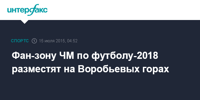 Москва. 15 июля. INTERFAX.RU - На недавнем совещании АНО "Дирекция Московского транспортного узла" было решено отказаться от планов по организации фан-зоны на главной площади столицы и разместить основную площадку для болельщиков Чемпионата мира по футболу в 2018 году на Воробьевых горах, сообщают "Известия" в среду.