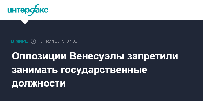 Москва. 15 июля. INTERFAX.RU - Одна из лидеров венесуэльской оппозиции Мария Корина Мачадо заявила, что власти страны запретили ей занимать государственные должности в течение года, сообщает BBC News. По ее словам, причину запрета ей не объяснили, однако считает, что это помешает ей принять участие в парламентских выборах, которые пройдут в декабре.