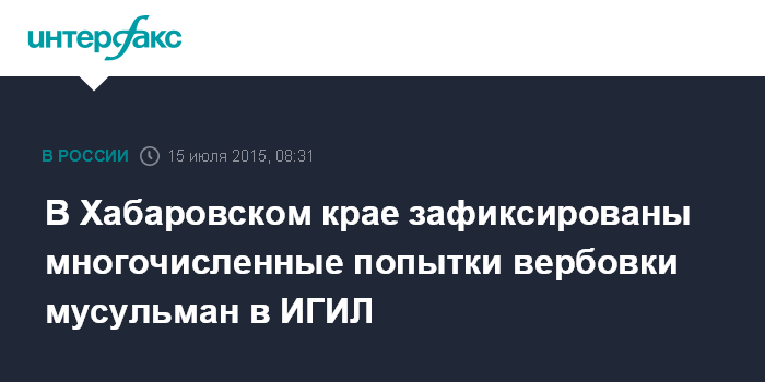 Москва. 15 июля. INTERFAX.RU – В Хабаровском крае появились свидетельства того, что боевики террористической организации "Исламское государство", запрещенной в России, ведут активную вербовку, сообщил в среду Хамза Кузнецов, председатель регионального общественного движения мусульман региона "Содружество".