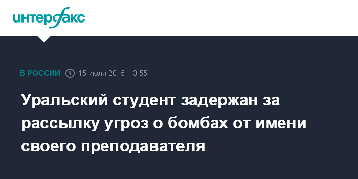 Москва. 15 июля. INTERFAX.RU - Правоохранительные органы Свердловской области задержали студента одного из уральских вузов, подозреваемого в ложных сообщениях о минировании 14 объектов, написанных от имени его предодавателя, сообщает пресс-служба ГУ МВД России по региону в среду.