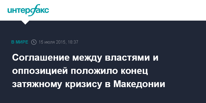 Москва. 15 июля. INTERFAX.RU - Представителям властей и оппозиции Македонии в среду удалось достичь окончательного соглашения по урегулированию многомесячного политического кризиса, сообщает агентство Associated Press.