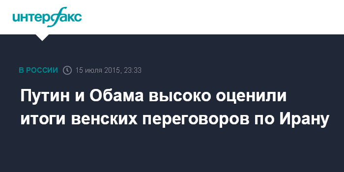 Москва. 15 июля. INTERFAX.RU - Президент России Владимир Путин и его американский коллега Барак Обама обсудили итоги венских переговоров по иранской ядерной программе (ИЯП) и дали им высокую оценку, сообщает в среду пресс-служба Кремля.