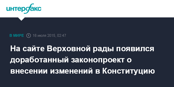 Москва. 16 июля. INTERFAX.RU - На сайте Верховной рады Украины в среду, 15 июля, был обнародован проект закона о внесении изменений в Конституцию Украины относительно децентрализации власти с пометкой "доработанный".