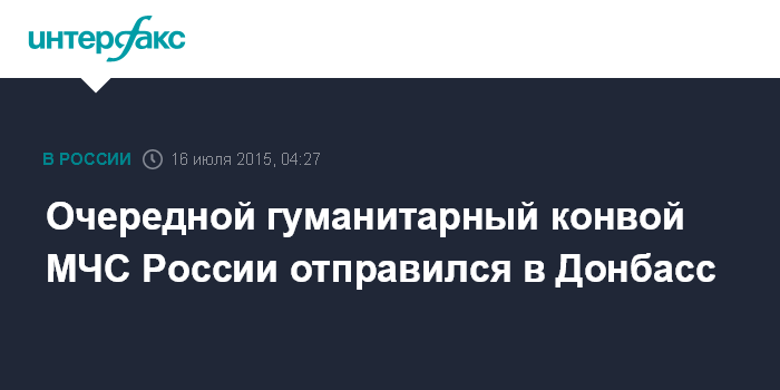 Москва. 16 июля. INTERFAX.RU - МЧС России направило в Донбасс очередную автоколонну с гуманитарной помощью, сообщили "Интерфаксу" в пресс-службе ведомства.