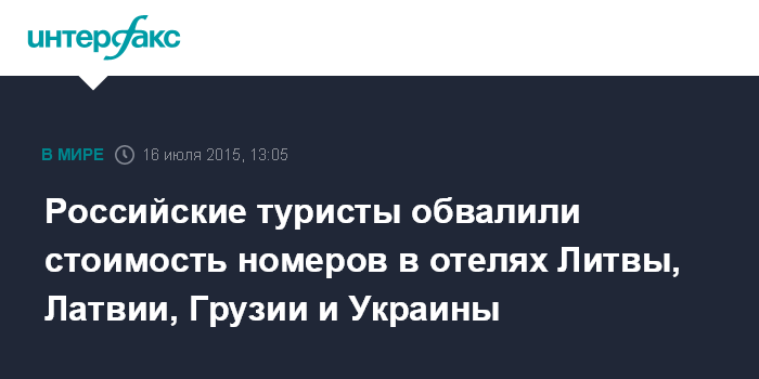 Москва. 16 июля. INTERFAX.RU - Сокращение количества туристов из России уменьшило стоимость ночи в отелях Литвы, Латвии, Грузии и Украины. К такому выводу пришли эксперты туристического сервиса Hotellook, сопоставив статистику национальных туристических ведомств со средней стоимостью номера.