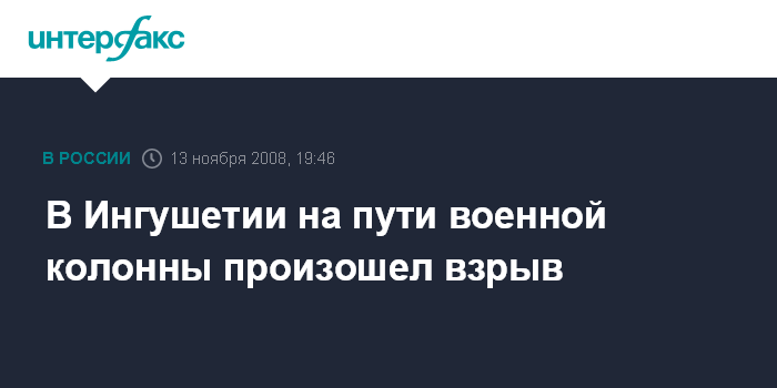 Москва. 13 ноября. INTERFAX.RU - На федеральной трассе "Кавказ" между Назранью и станицей Троицкая во время прохождения военной колонны произошел взрыв.