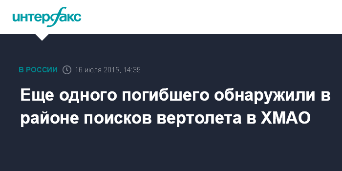 Москва. 16 июля. INTERFAX.RU - Спасатели в четверг в ходе поисков пропавшего в Ханты-Мансийского автономном округе вертолета Ми-8 нашли еще одного погибшего, сообщили агентству "Интерфакс" в пресс-службе ГУ МЧС по региону.