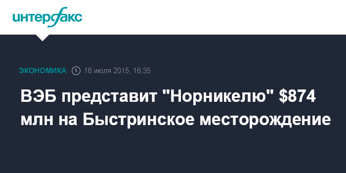 Москва. 16 июля. INTERFAX.RU – ВЭБ может представить около $874 млн "Норникелю" для освоения Быстринского месторождения золото-железо-медистых руд (Забайкальский край), следует из материалов банка. Это 63% стоимости проекта, который будет прокредитован в юанях (в эквиваленте $874 млн). Общая стоимость проекта - $1,378 млрд.