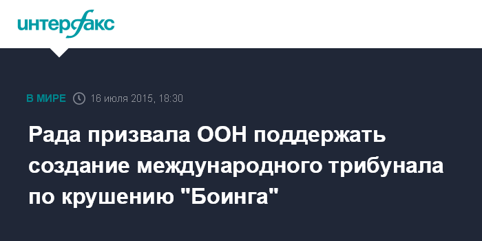 Москва. 16 июля. INTERFAX.RU - Верховная рада Украины обратилась к Организации объединенных наций и мировому сообществу с просьбой поддержать создание международного трибунала для судебного преследования виновных в крушении малайзийского "Боинга" на востоке Украины.