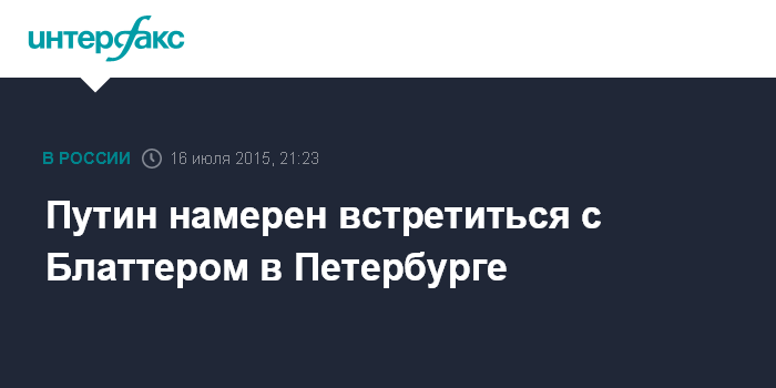 Москва. 16 июля. INTERFAX.RU - Пресс-секретарь президента РФ Дмитрий Песков сообщил о планах главы государства Владимира Путина встретиться с президентом Международной федерации футбола Йозефом Блаттером.