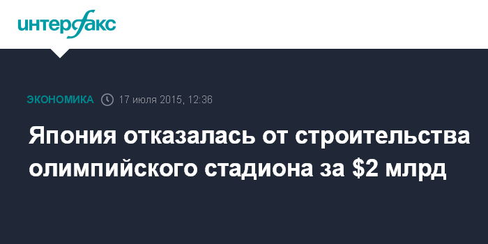 Москва. 17 июля. INTERFAX.RU – Японское правительство решило отказаться от проекта строительства нового стадиона к летним Олимпийским играм 2020 года и провести новый тендер на дизайн для данного объекта, сообщает агентство Bloomberg.