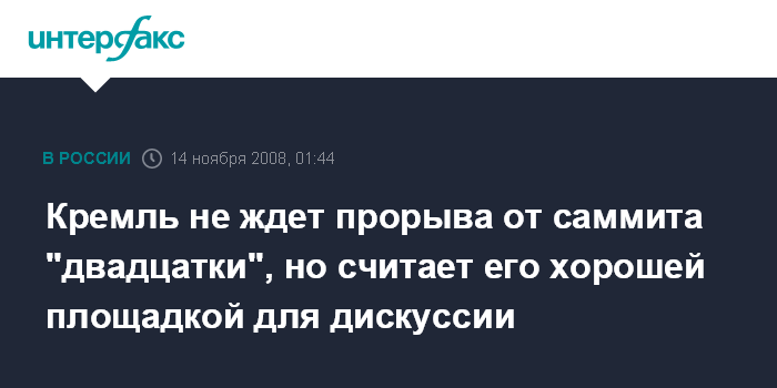 Москва. 14 ноября. ИНТЕРФАКС - Москва не ожидает прорыва от саммита "двадцатки" и скорейшего создания новой финансовой системы взамен существующей с момента окончания Второй мировой войны Бреттон-Вудской, сообщил "Интерфаксу" источник в Кремле.