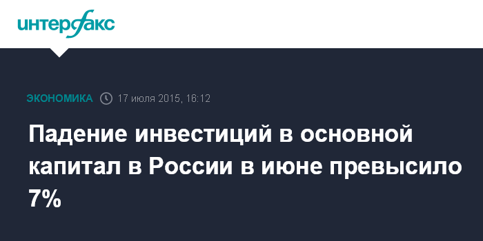 Москва. 17 июля. INTERFAX.RU – Инвестиции в основной капитал в России в июне 2015 года сократились на 7,1% по сравнению с июнем 2014 года, сообщил в пятницу Росстат.