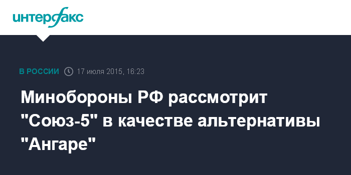 Москва. 17 июля. INTERFAX.RU - Минобороны России готово рассмотреть разрабатываемую в Самаре ракету-носитель "Союз-5" в качестве альтернативы "Ангаре", сообщил в пятницу заместитель министра обороны РФ Юрий Борисов, отвечающий за вопросы вооружения.