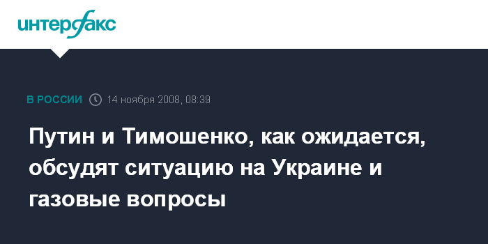 Москва. 14 ноября. INTERFAX.RU - Премьер-министр РФ Владимир Путин "на полях" Совета глав правительств СНГ в Молдавии в пятницу обсудит с главой правительства Украины Юлией Тимошенко политическую ситуацию в ее стране и сотрудничества в газовой сфере, сообщил замруководителя аппарата правительства РФ Юрий Ушаков.