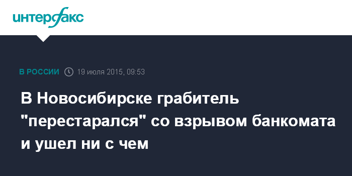 Москва. 19 июля. INTERFAX.RU - Неизвестный подорвал банкомат в Новосибирске, но скрылся, ничего не взяв, сообщили "Интерфаксу" в пресс-центре МВД России в воскресенье.